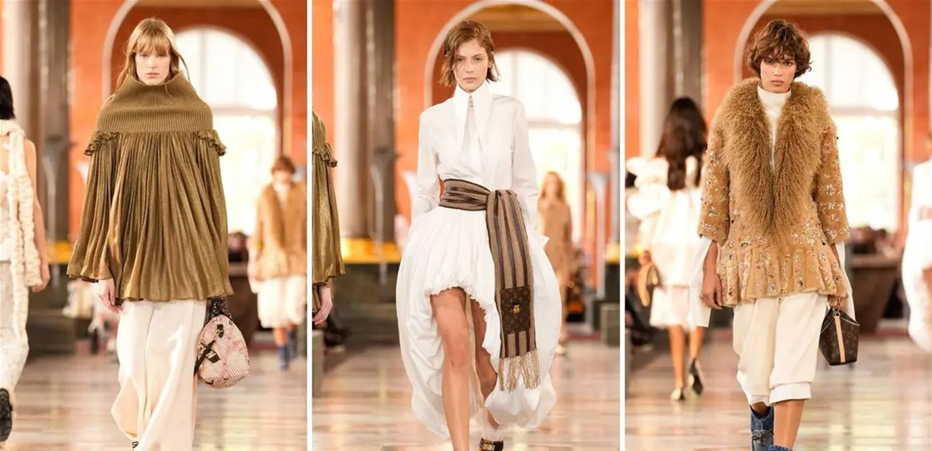 أما لويس فويتون، فقدمت عرضها في متحف اللوفر، حيث لعب نيكولا غيسكيير على التناقضات بتحويل قطع مألوفة إلى استثنائية عبر الكريستال، الكورسيهات، والأثواب المزينة بالخرز، لتظهر تصاميم تمزج بين الطابع المستقبلي واللمسات الحرفية الراقية.