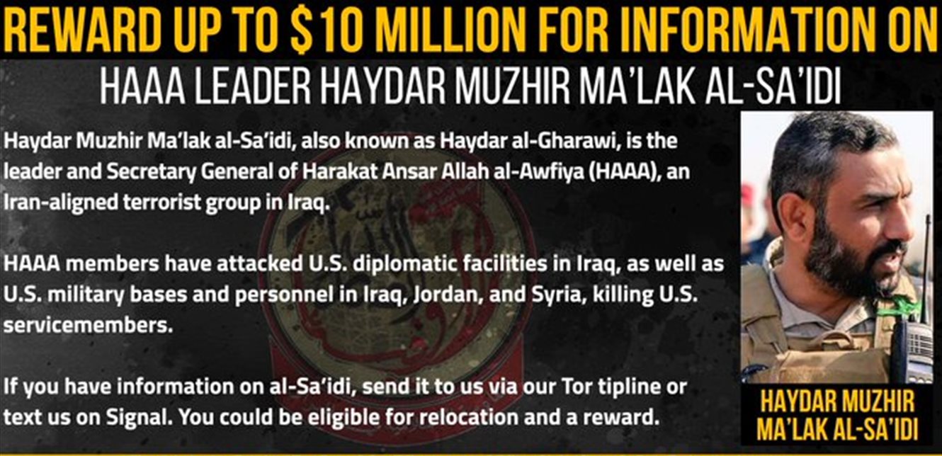 أعلنت وزارة الخارجية الأميركية عبر برنامج “المكافآت من أجل العدالة”، عن تخصيص مكافأة تصل إلى 10 ملايين دولار مقابل معلومات تؤدي إلى تحديد هوية أو مكان حيدر مزهر ملك السعيدي المعروف باسم “حيدر الغراوي”، الذي تتهمه بقيادة هجمات استهدفت مصالح أميركية وحليفة في الشرق الأوسط.