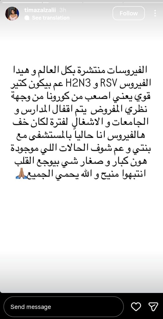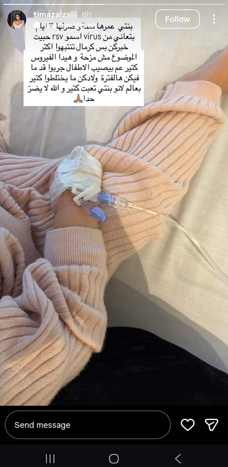 أعلنت مُقدّمة البرامج تيما زلزلي، أنّ ابنتها البالغة من العمر سنة، دخلت إلى المستشفى بعد إصابتها بفيروس “rsv”.