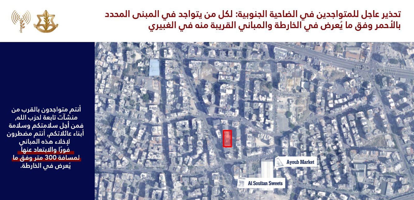 وجّه الجيش الإسرائيلي إنذارًا عاجلًا إلى المتواجدين في الضاحية الجنوبية لبيروت، وتحديدًا في حي الغبيري، طالب فيه بإخلاء مبانٍ محددة ظهرت على خارطة مرفقة.