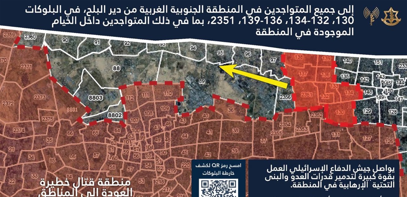 أصدر الجيش الإسرائيلي، اليوم الأحد، تحذيرًا لجميع المتواجدين في المنطقة الجنوبية الغربية من دير البلح، خاصة في البلوكات 130، 132-134، 136-139، و2351، بضرورة الإخلاء الفوري، بما في ذلك من يقطنون في الخيام داخل هذا النطاق.