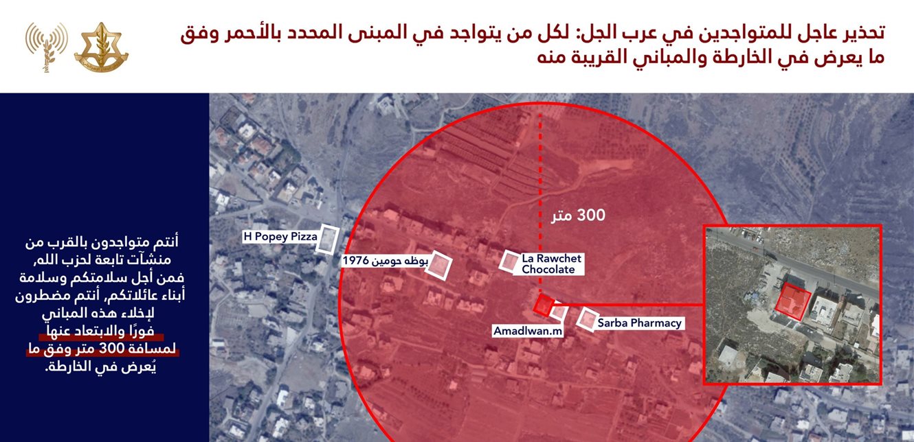 وتوجه ادرعي سكان المبنى المحدد بالأحمر في الخريطة المرفقة والمباني المجاورة له قائلاً: أنتم تتواجدون بالقرب من مبنى يستخدمه حزب الله الإرهابي فمن أجل سلامتكم أنتم مضطرون لإخلائه فورًا والابتعاد عنه لمسافة لا تقل عن 300 متر، مشدداً على ان البقاء في منطقة المباني المحددة يعرضكم للخطر.