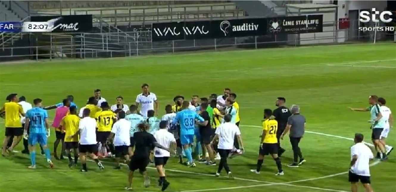 وتحول ملعب “ساو لويس” بمدينة فارو البرتغالية، إلى ساحة قتال واشتباكات بين لاعبي الفريقين، مما أجبر حكم الساحة على إنهائها قبل الوقت الأصلي.