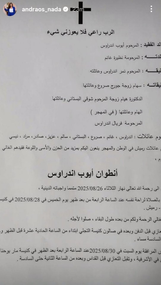أعلنت الإعلامية في الـ lbci ندى اندراوس وفاة عمها أنطوان اندراوس.