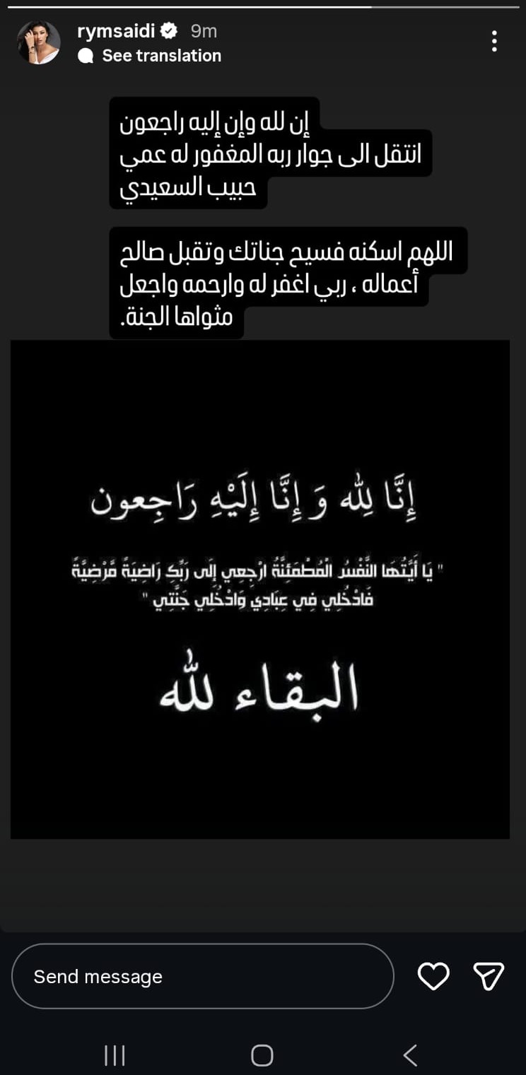 وقالت ريم عبر خاصية “ستوري” عبر حسابها على “انستغرام”: “إن لله وإن إليه راجعون، انتقل إلى جوار ربه المغفور له عمي حبيب السعيدي”.
