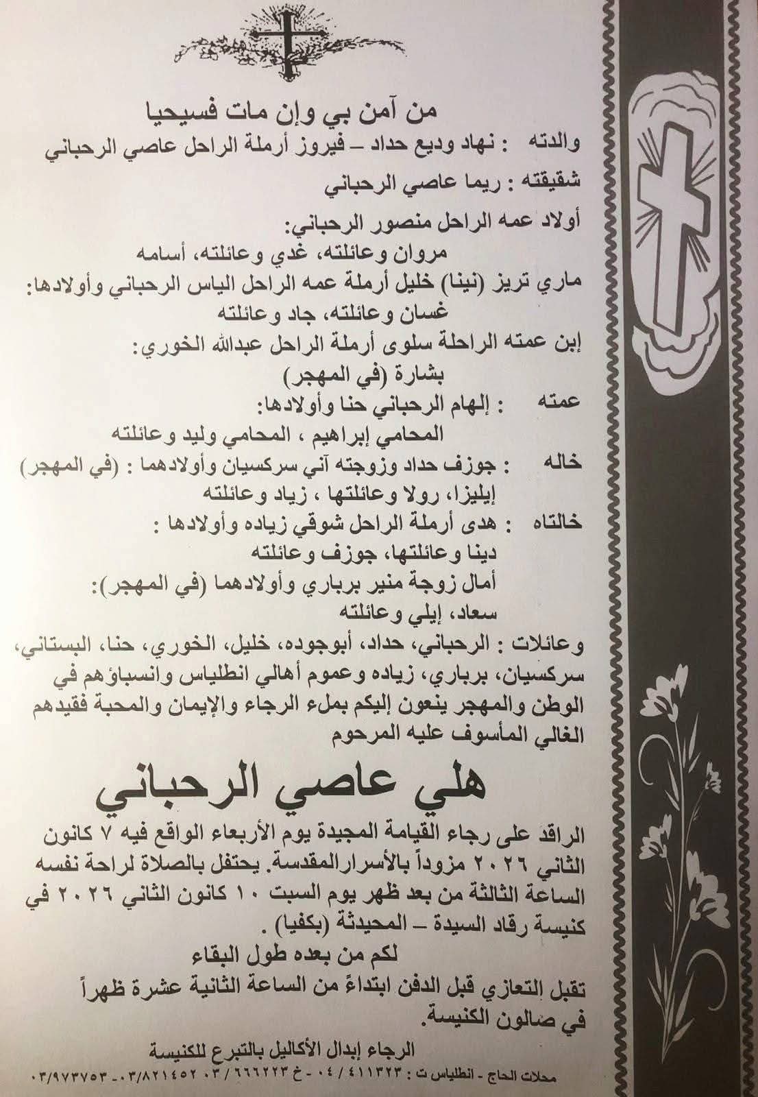 يُحتفل بالصلاة لراحة نفسه عند الساعة الثالثة من بعد ظهر يوم السبت 10 كانون الثاني، في كنيسة رقاد السيدة – المحيدثة بكفيا.