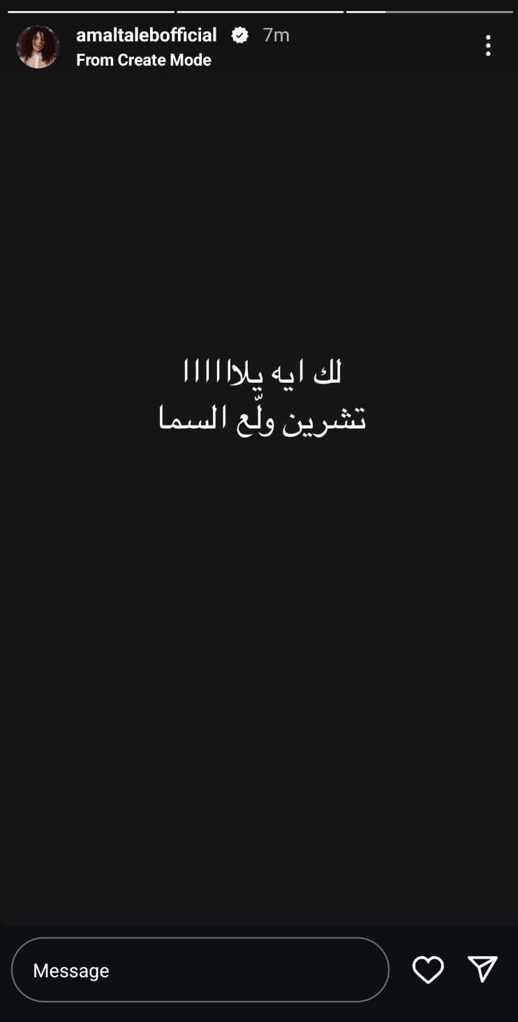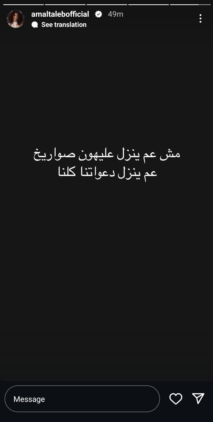علّقت الممثلة أمل طالب على إطلاق إيران صواريخ باتّجاه إسرائيل ليل أمس، وقالت عبر خاصية “ستوري” عبر حسابها على “انستغرام”: “مش عم ينزل عليهن صواريخ، عم ينزل دعواتنا كلنا”.