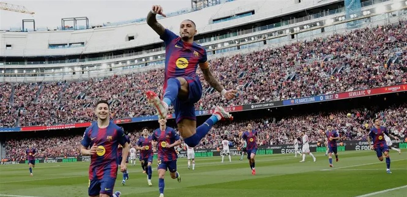 حافظ برشلونة المتصدر على فارق النقاط الأربع مع ملاحقه ريال مدريد، بعد فوزه العريض بقيادة نجمه البرازيلي رافينيا على ضيفه إشبيلية 5-2 الأحد في المرحلة 28 من الدوري الإسباني لكرة القدم.