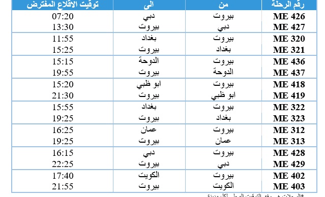 7) تأجيل رحلة العودة جدة – بيروت المجدولة ليوم الأربعاء بتاريخ 4 آذار 2026 تحت رقم ME369 الى يوم الخميس الواقع في 5 آذار بحيث يصبح موعد اقلاعها الجديد 09:40 صباحأً بتوقيت السعودية.