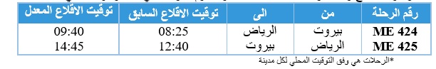 6) تأجيل رحلة العودة جدة – بيروت المجدولة ليوم الثلاثاء بتاريخ 3 آذار 2026 تحت رقم ME369 الى يوم الأربعاء الواقع في 4 آذار بحيث يصبح موعد اقلاعها الجديد 09:40 صباحأً بتوقيت السعودية.