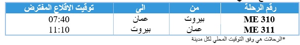 10) الغاء الرحلة المسائية ME312/313 المجدولة الى عمان يوم الاربعاء في 4 آذار بالاضافة الى