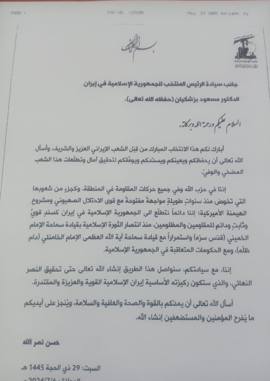 أبرق الأمين العام لـ”حزب الله” السيّد حسن نصرالله إلى الرئيس الإيراني الجديد مسعود بزشكيان مباركاً له بانتخاب رئيساً للجمهورية الإسلامية في إيران.