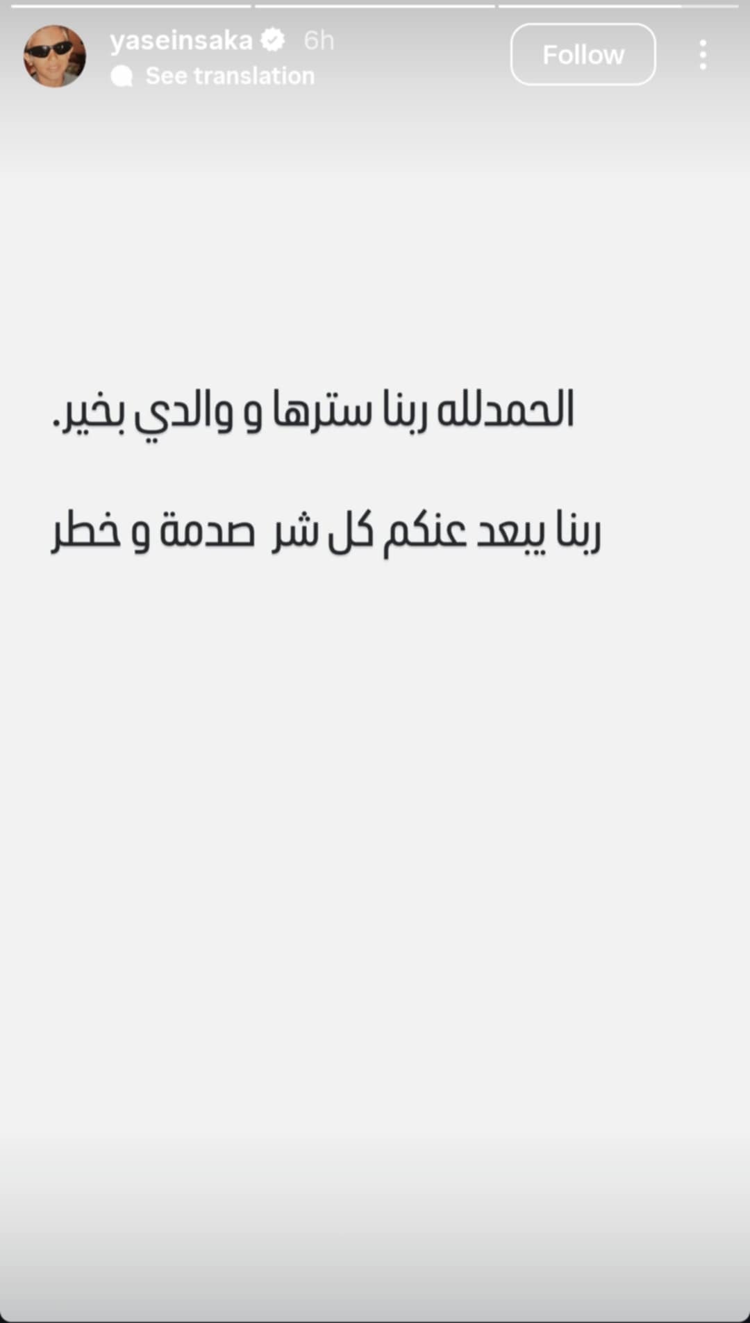 ونشر ياسين ستوري عبر حسابه الشخصي على موقع الصور والفيديوهات إنستغرام كتب فيها منشور كان نصه: “الحمد لله ربنا سترها ووالدي بخير، ربنا يبعد عنكم كل شر صدمة وخطر”، ومن الواضح أن والده لم يتعرض لأي إصابة تستدعي نقله للمستشفى أو إجراء أي فحوصات.