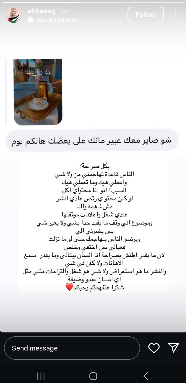 وكتبت الصغير عبر خاصية “ستوري” عبر حسابها على “انستغرام”: “الناس قاعدة تهاجمني من ولا شي واعملي هيك وما تعملي هيك السبب؟ انو انا محتواي اكل لوكان محتواي رقص عادي انشر واعلانات موقفتها وموضوع اني وقف ما بفيد حدا بشي ولا بغير شي بس بضرني الي وبرضو. الناس بتهاجمك حتى لوما نزلت فعبالي بس اختفي وخلص لان ما بقدر اطنش بصراحة انا انسان بيتأذى وما بقدر اسمع الاهانات”.