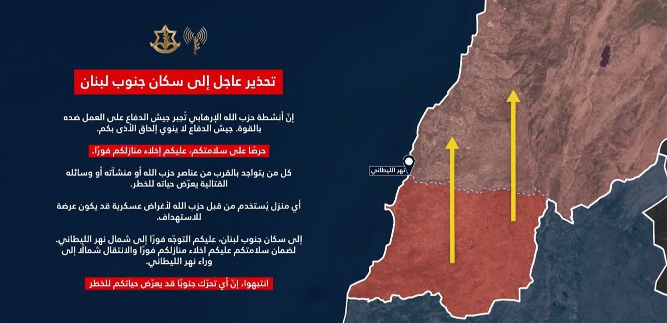 وأضاف: “أي منزل يُستخدم من قبل حزب الله لأغراض عسكرية قد يكون عرضة للاستهداف. إلى سكان جنوب لبنان، عليكم التوجّه فورًا إلى شمال نهر الليطاني. لضمان سلامتكم عليكم اخلاء منازلكم فورًا والانتقال شمالًا إلى وراء نهر الليطاني. انتبهوا، إنّ أي تحرّك جنوبًا قد يعرّض حياتكم للخطر”.