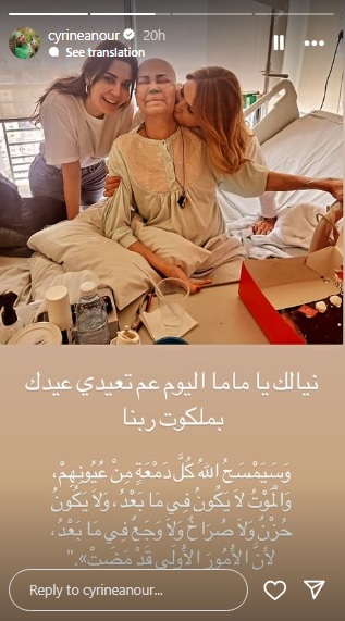 نشرت الفنانة سيرين عبدالنور صورة عبر خاصيّة “ستوري” عبر حسابها على “انستغرام”، برفقة والدتها الراحلة في المستشفى، أثناء تلقيها العلاج.