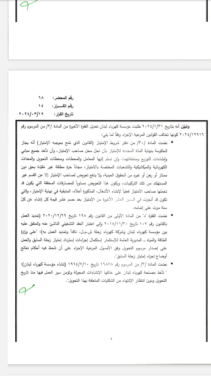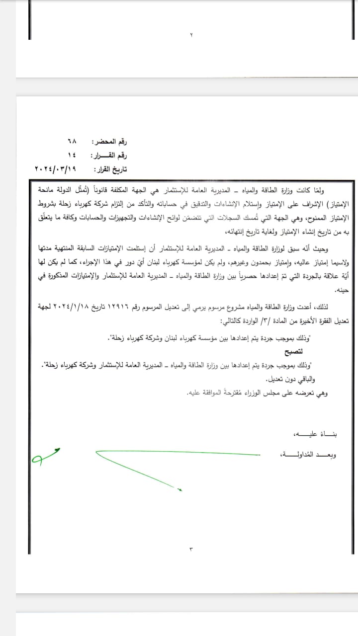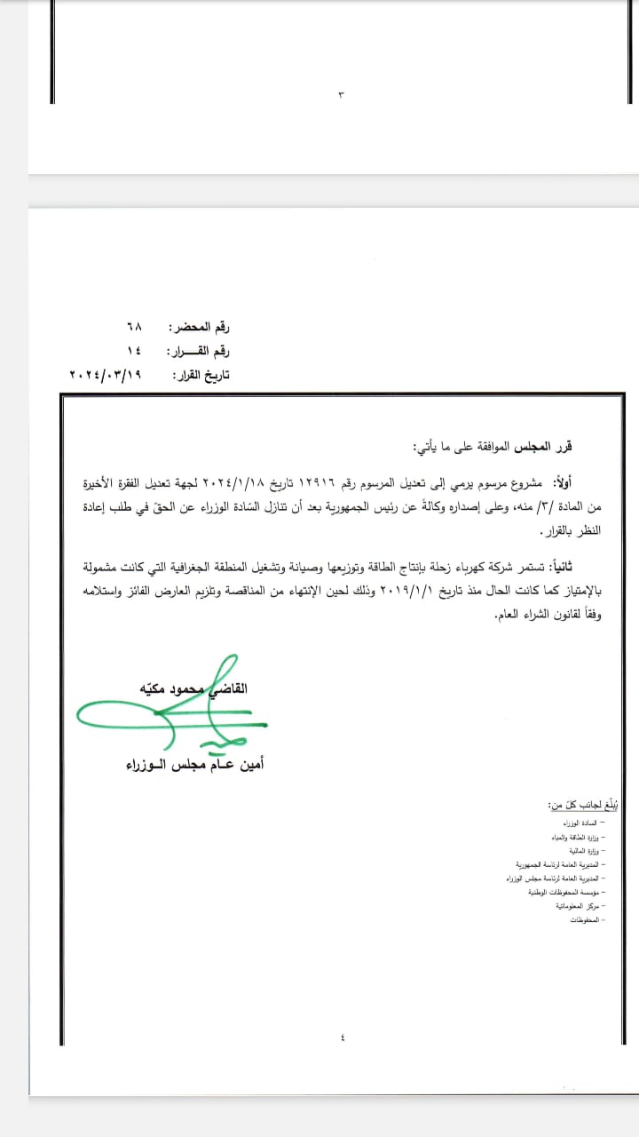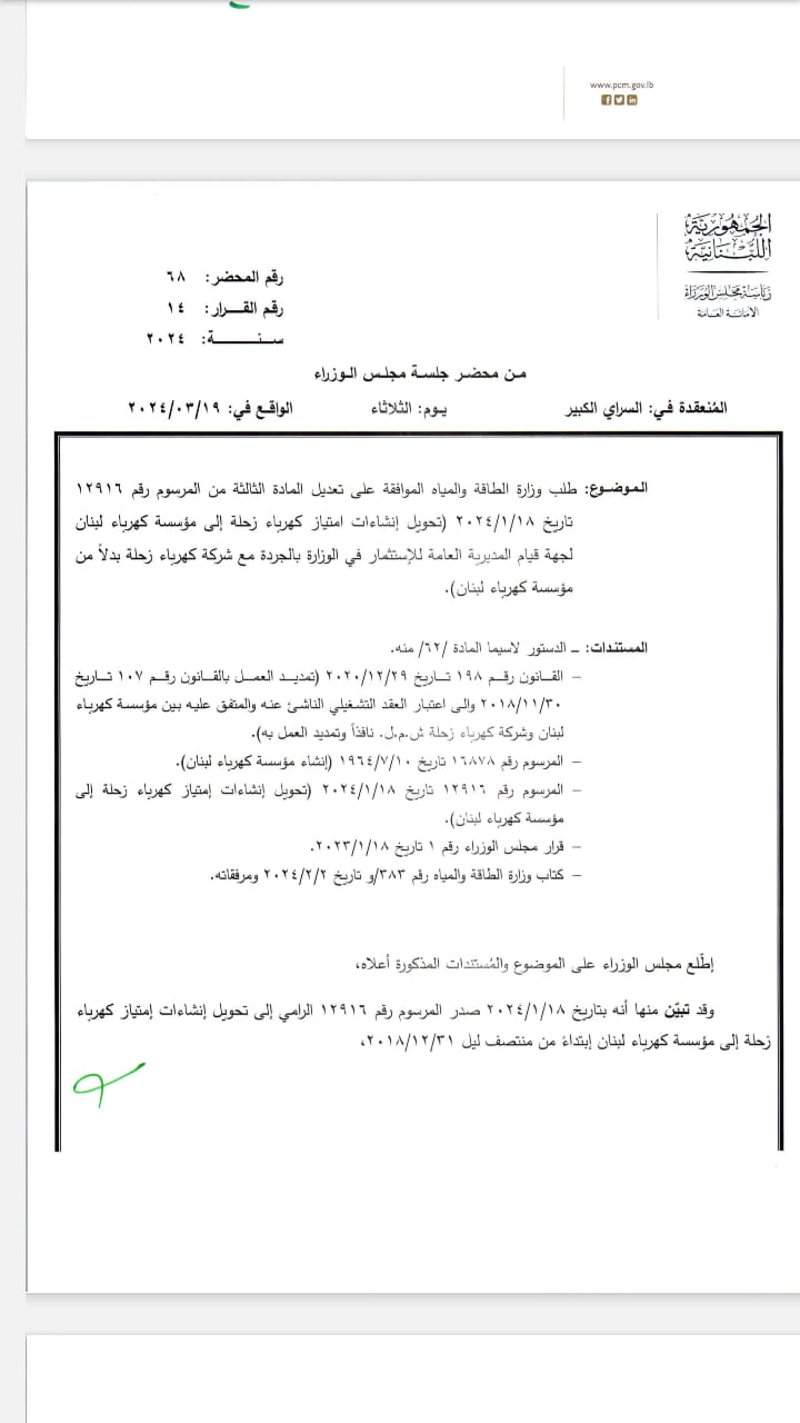 ووافق مجلس الوزراء على استمرار كهرباء زحلة بإنتاج الطاقة وتوزيعها وصيانة وتشغيل المنطقة الجغرافية التي كانت مشمولة بالإمتياز كما كانت الحال منذ تاريخ 1-1-2019، وذلك لحين الإنتهاء من المناقصة وتلزيم العارض الفائز واستلامه، وفقاً لقانون الشراء العام.