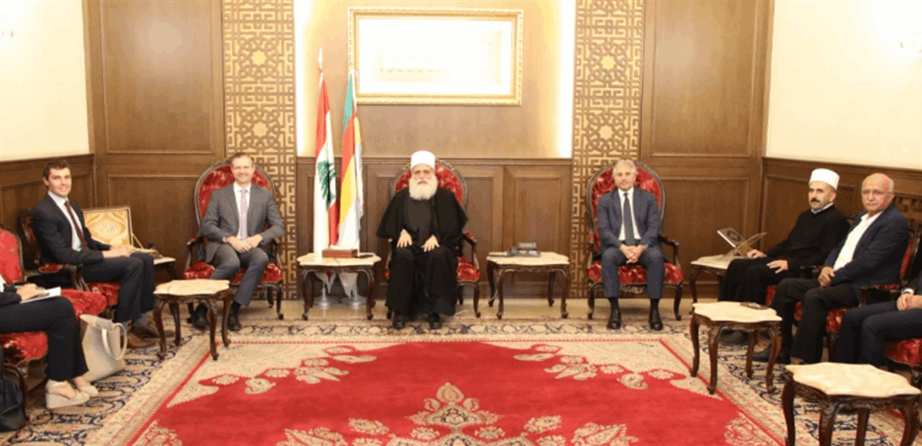 التقى شيخ العقل لطائفة الموحدين الدروز الشيخ الدكتور سامي ابي المنى في دار الطائفة في بيروت اليوم، وفدا من اركان السفارة الاميركية في لبنان ضم: المستشار السياسي والاقتصادي جايمي أوميلا، منسق المساعدات الخارجية إيثان لينش وفيرونيكا شيو مسؤولة الشؤون الدينية، في حضور اعضاء من المجلس المذهبي ومستشارين في مشيخة العقل.