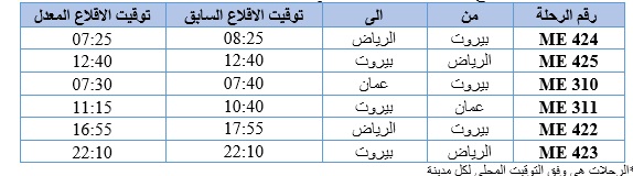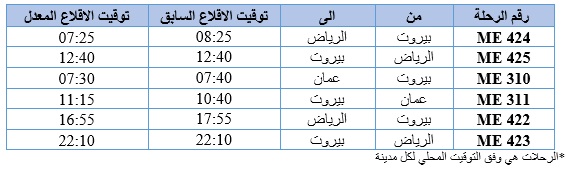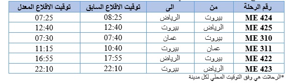 1- الغاء رحلات دبي النظامية المسائية والليلية المجدولة تحت رقم ME428/429 و ME430/431 للفترة الممتدة من الثلاثاء 24 آذار ولغاية الأثنين 30 آذار 2026 ضمناً، مع ابقاء الرحلة الصباحية المجدولة ME426/427 وفقاً للمواعيد التالية: