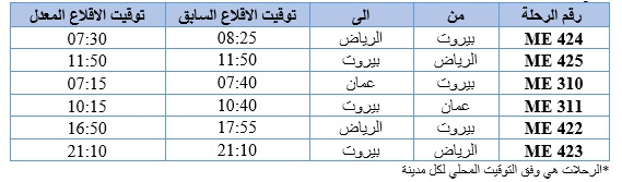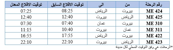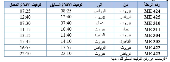 تلغى كافة رحلات الشركة النظامية المجدولة الى كل من: أثينا، روما، أبو ظبي، بغداد، الكويت، الدوحة، النجف، اربيل بالأضافية الى رحلتي دبي المسائية والليلية  ME428/429 و ME430/431 ورحلة عمان المسائية ME312/313، بالاضافة الى دمج رحلات جدة، مع تعديل بعض مواعيد اقلاع رحلات الشركة وفقاً للتالي: