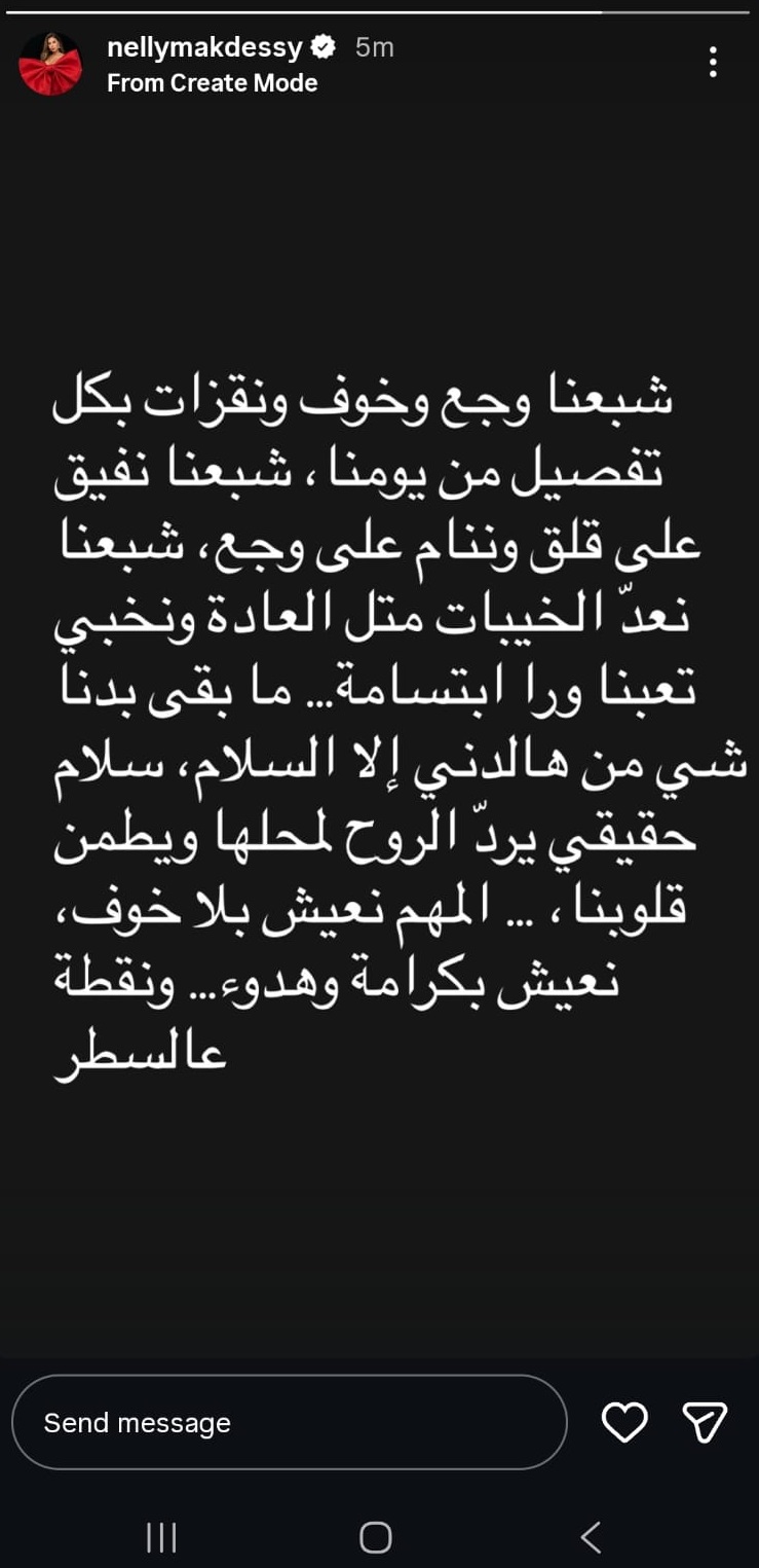 قالت الفنانة نيللي مقدسي “شبعنا وجع وخوف ونقزات بكل تفصيل من يومنا، شبعنا نفيق على قلق ونام على وجع، شبعنا نعدّ الخيبات متل العادي ونخبي تعبنا ورا إبتسامة”.