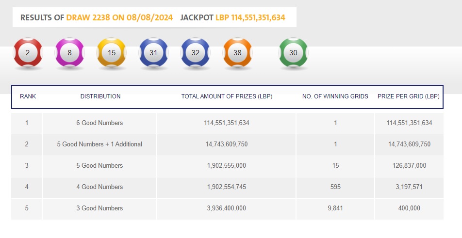 وتجدر الإشارة إلى أنّ الأرقام الرابحة هي 2 و8 و15 و31 و32 و38، بينما الرقم السابع الإضافي هو 30. (رصد لبنان 24)