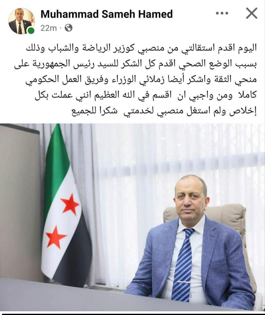 وتوجه الوزير المستقيل بالشكر إلى رئيس الجمهورية أحمد الشرع على منحه الثقة، وإلى زملائه في الحكومة وفريق العمل.