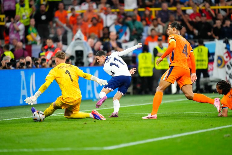 وفي الدقيقة 65، حاولت هولندا كسر إيقاع المباراة عبر فان دايك الذي سدّد كرة أنقذها الحارس الانكليزي بيكفورد.