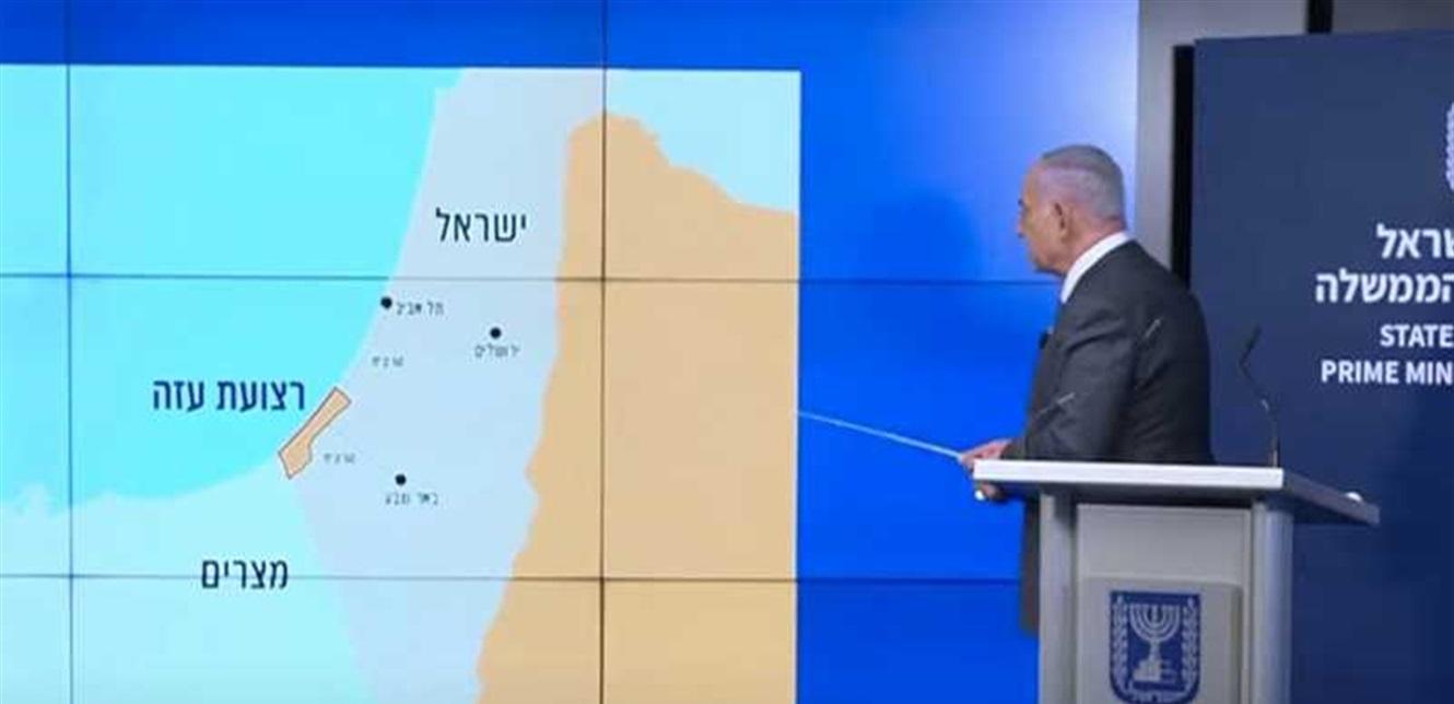 وكان نتنياهو يتحدث خلال مؤتمر صحفي عن أهمية سيطرة الجيش الإسرائيلي على محور فيلادلفيا الحدودي بين قطاع غزة ومصر، لكن خلو الخريطة من أي إشارة إلى الضفة كان لافتا.
