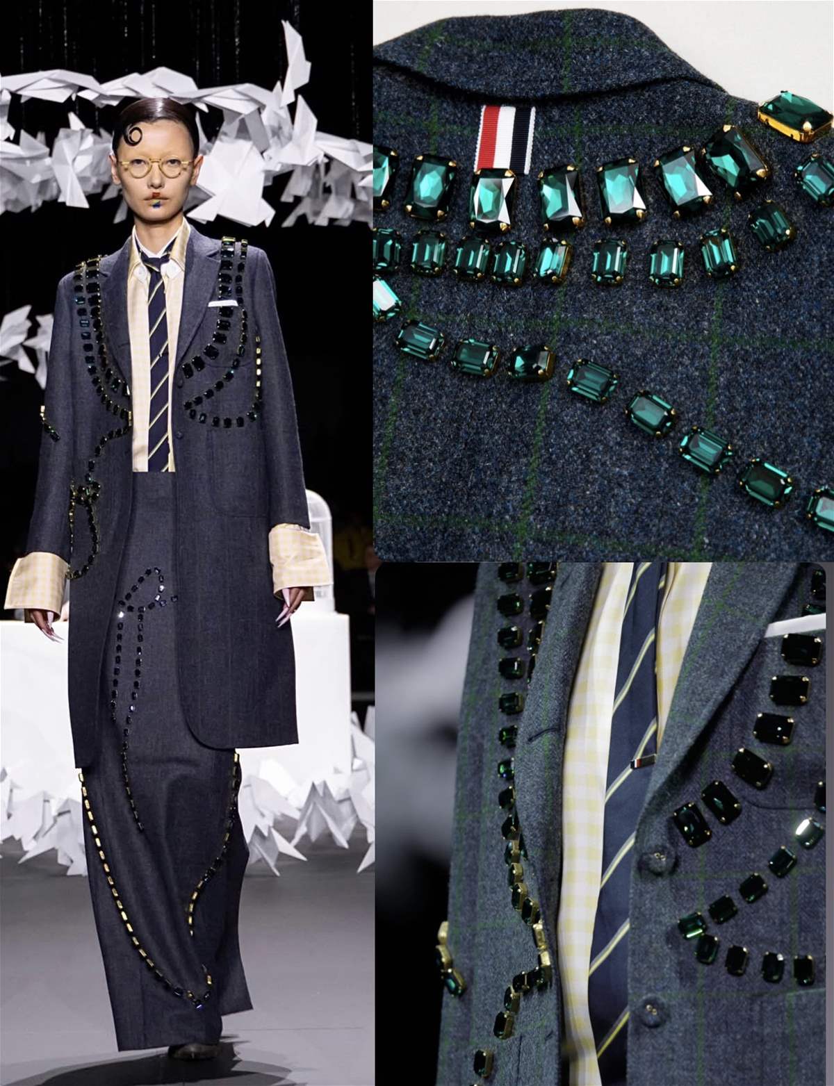 وقد اختارت خبيرة المظهر ميريديث كوب لميشيل تنّورة وسترة من توم براون (Look 44)، بتصميم يجسّد مفهوم Power Dressing بأسلوب أنثوي عصري مواكب لموضة 2026. الإطلالة جاءت من قماش التويد البريطاني الرمادي مزين بخيوط زمرديّة ناعمة وتطريزات كريستال سواروفسكي، مع قميص أبيض بمربعات صفراء وربطة عنق مخططة، ما أضفى توازنًا بين الرصانة والأنوثة.